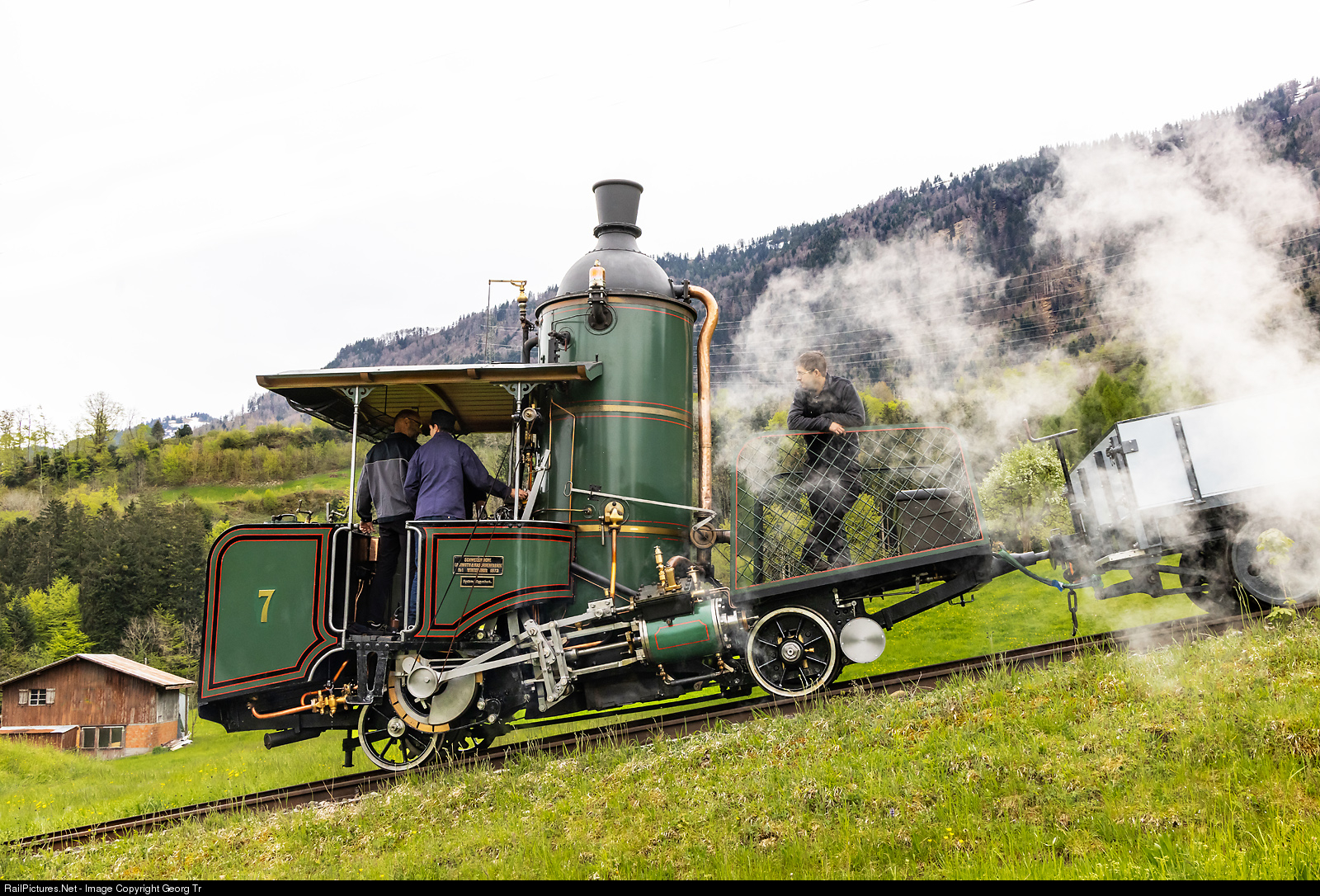 For celebration of 150 years of the first cogwheel mountain railway in Europe, the worldwide unique operational cogwheel steamlocomotive with an upright boiler, the famous number seven, H 1/2 # 7 was taken out of the Swiss Museum of Transport in Lucerne and made operational again. The locomotive, which was built in 1873 as first product of the Swiss Locomotive and Machine works (SLM) for the Rigi-Bahn from Vitznau up to Rigi Kulm. The very first 6 locomotives of the Rigi-Bahn were delivered by the Schweizerische Centralbahn works in Olten, but were of a very similar construction. Now the famous H 1/2 # 7 is on the first testrun after 12 years, below Kräbel.