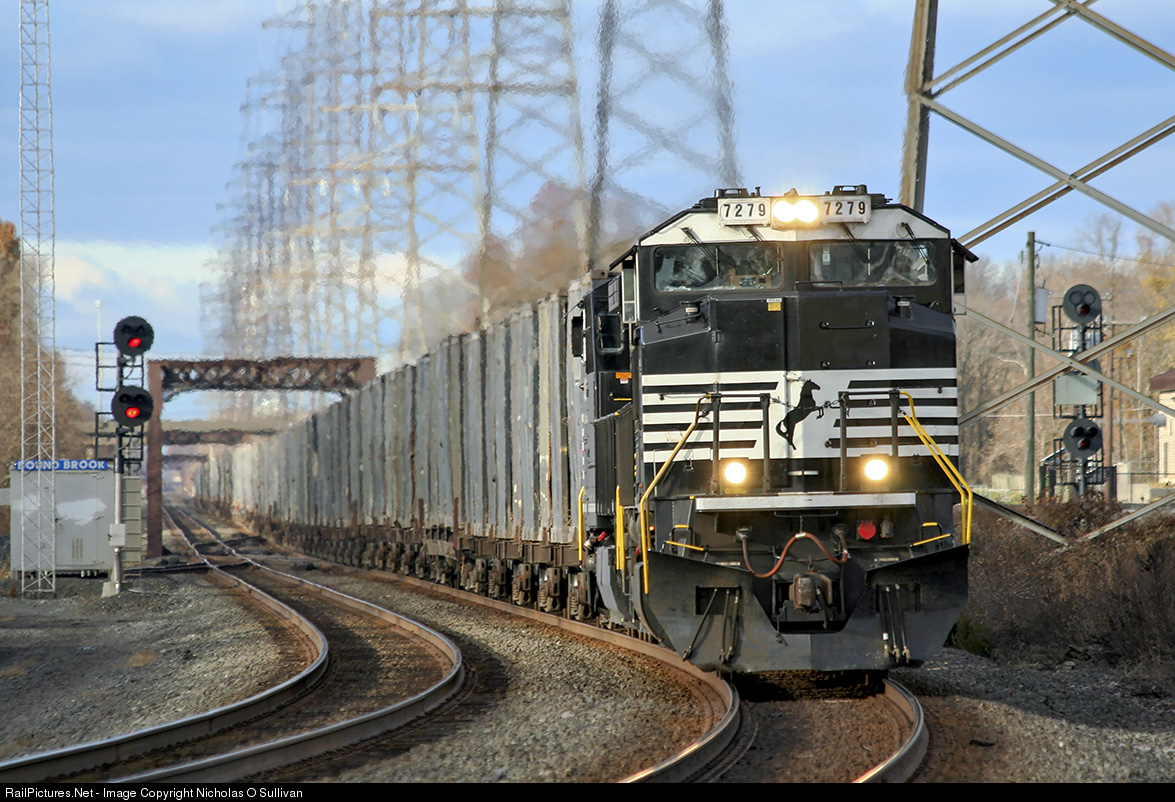 | A C U Later: After finishing work at BRI in Bridgewater, NS 62V is on the move east on Conrail Lehigh Line Track #1. The leader was purchased from Union Pacific in September of 2014. It formerly was SD9043MAC UP 3510 (later UP 8501 and later NS 7279). It was rebuilt to become a SD70ACU in 2016. In February of 2021, after only a few years being rebuilt, it was sold to Progress Rail (PRLX) along with 45 other Norfolk Southern SD70ACU units that month. Behind the leader is another rebuilt unit: AC44C6M NS 4046 (rebuilt from C40-9 NS 8783 in June of 2017). |