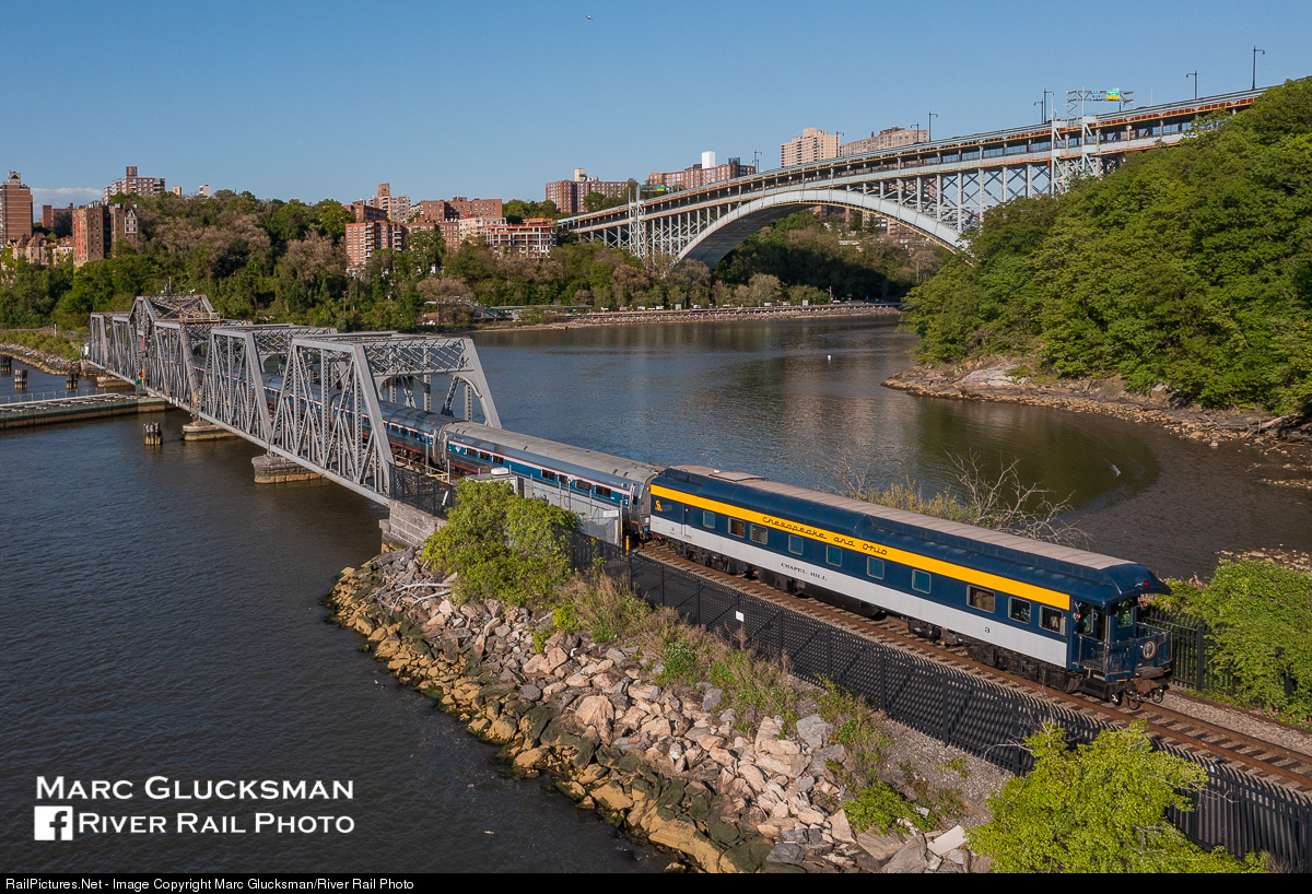 Chapel At The Creek. Former Chesapeake And Ohio business car "Chapel Hill" (PPCX 800043) held the markers for Amtrak 239 on Friday, May 14, 2021, seen crossing Spuyten Duyvil Creek. The colorful car was originally built by AC&F in 1922 as the private car "Hussar", was later sold to C&O, and is now again in private ownership.