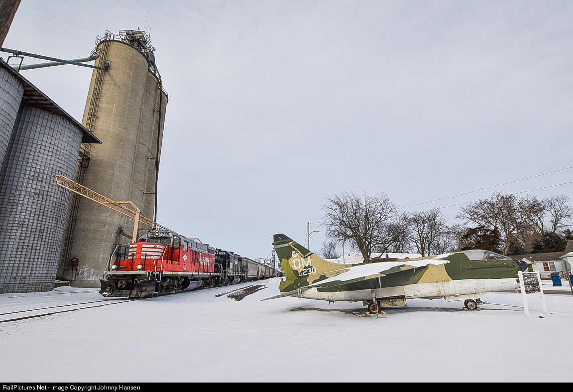 | BLOL 7591 and LTEX 3802 finish running around their train and make their way back south to Gibson City with loads beginning the journey back south heading south out of Cullom, seen here passing the Corsair II displayed in town. |