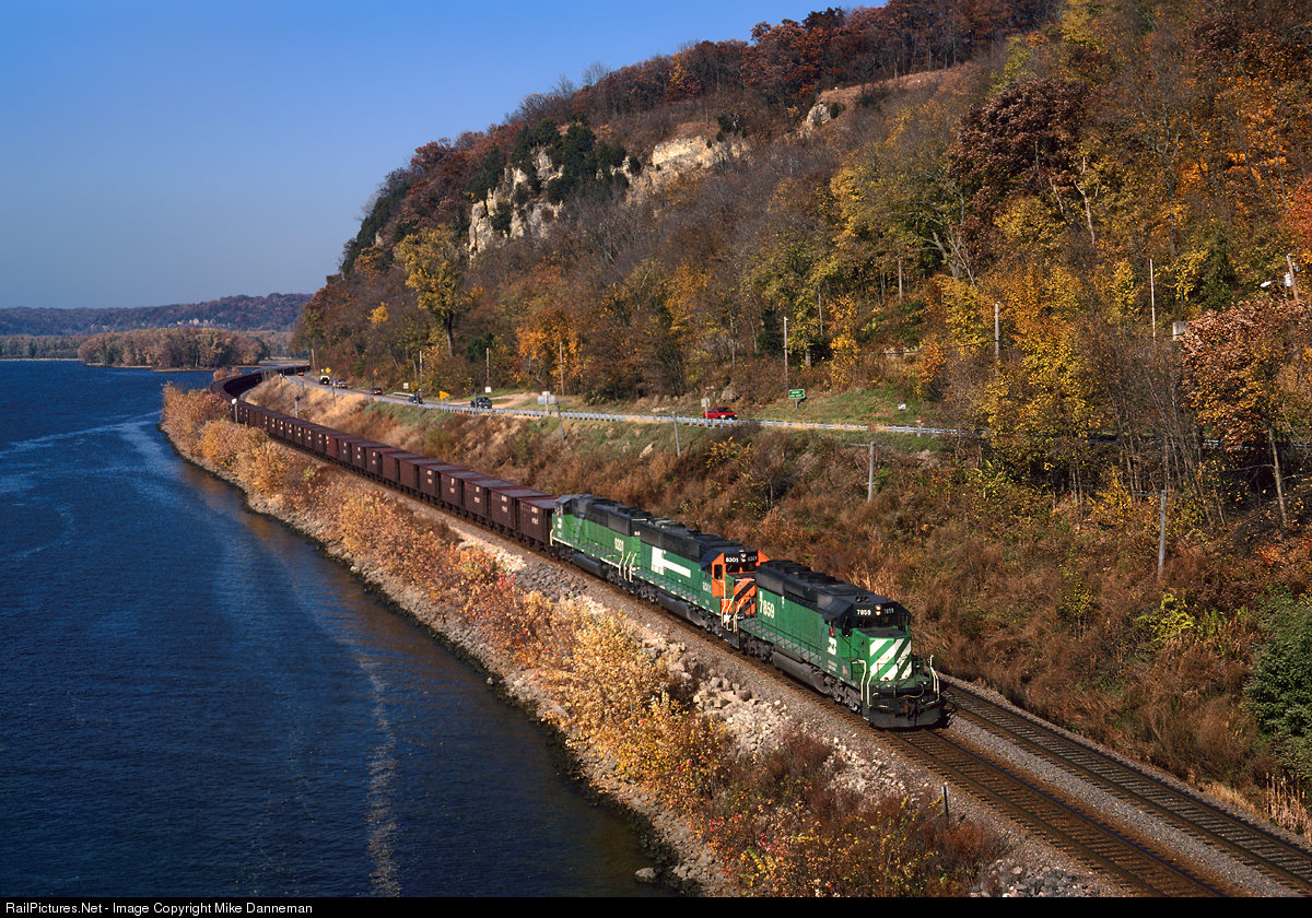 On the autumn day of October 25, 1992, a Burlington Northern taconite ore train headed for Granite City, near East St. Louis, follows the bank of the Mississippi River at Savanna, Illinois. The middle locomotive in the consist is one of three prototype EMD SD60 locomotives, originally painted in BN colors, but became part of EMD’s lease fleet by this date.