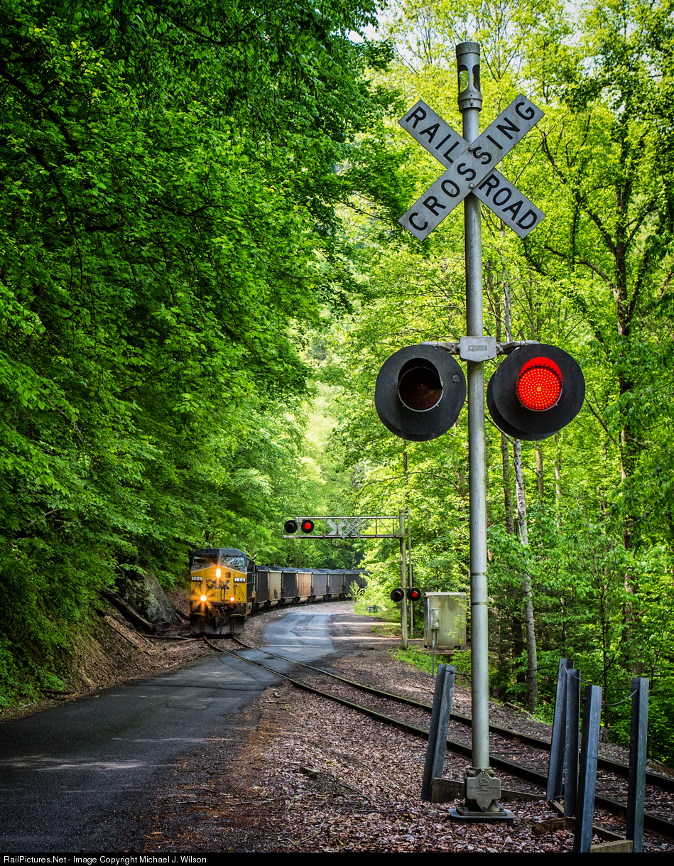 CSX #144 crawls across Thurmond Road with coal loads bound for interchange with CSX at Thurmond, WV on RJ Corman Railroad Group's, former C&O, Loup Creek Branch on May 18, 2021. Filled with bridges, S curves, waterfalls and rapids along Dunloup Creek the Loup Creek branch is a photographers dream and with spring foliage in full bloom on this day it's easy to see why.