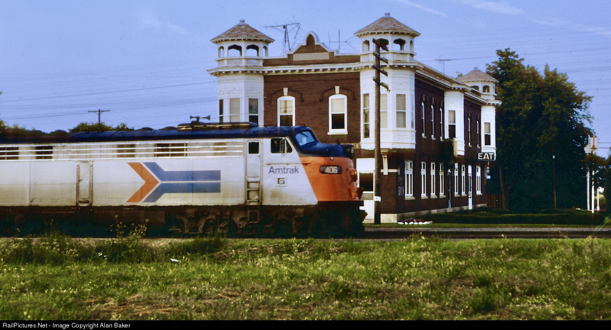 Former Milwaukee Road E9 30-C, now Amtrak 406, slows to its station stop at Sturtevant, past the Klinkert Hotel, which was kiddy-corner from the Milwaukee Road station. The Klinkert dates to an era when this railroad location was known as Western Union Junction.
