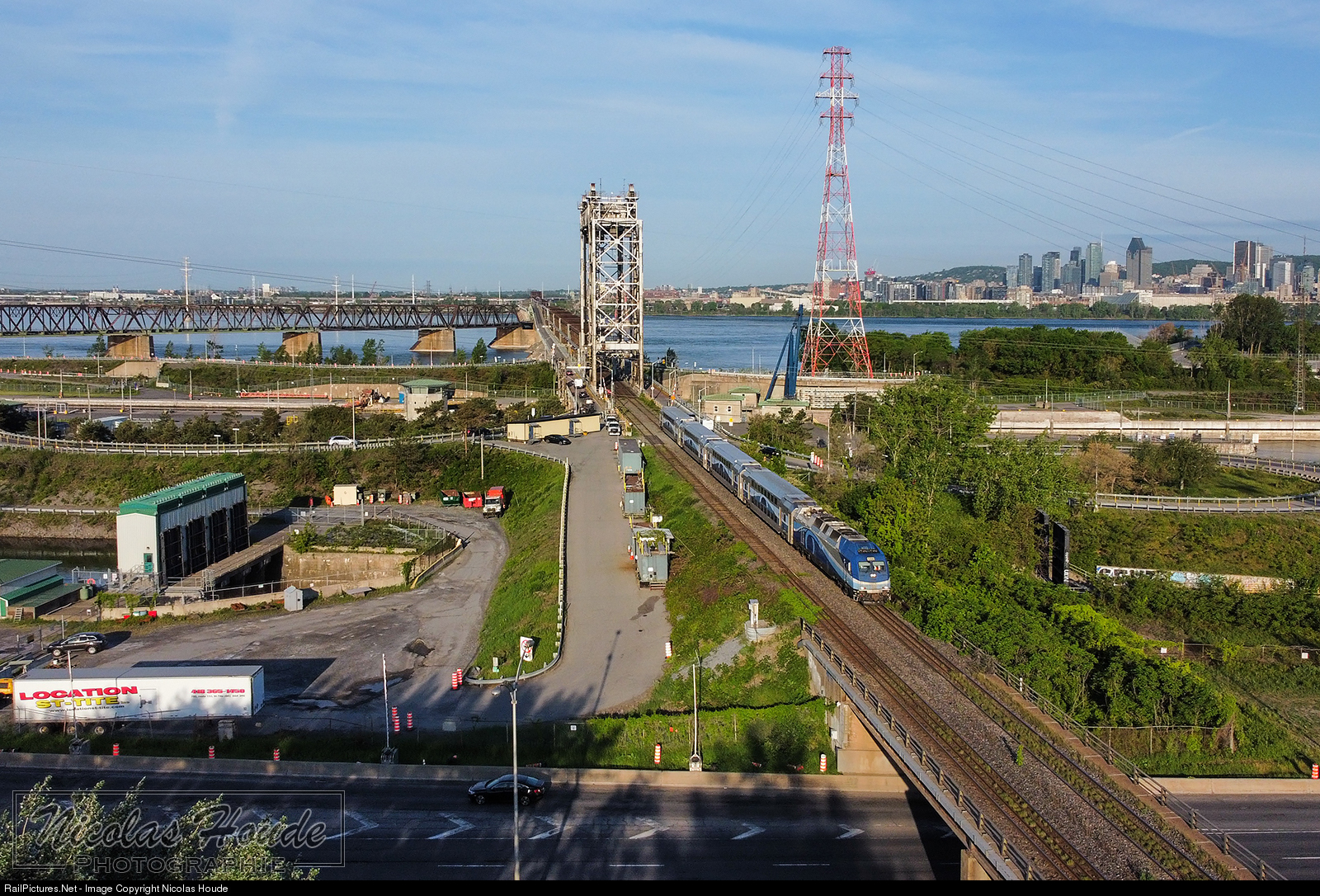 | On a gorgeous morning, EXO 890 exits the Victoria Bridge on the south shore of Montreal PQ. EXO 890 is a deadhead move from Central station to Mont-St-Hilaire to become the consist for EXO 809 (departure of 0800 at Mont-St-Hilaire station). At the far right, we can see downtown Montreal and on the left, the diversion which is used when a boat is in the lock. |