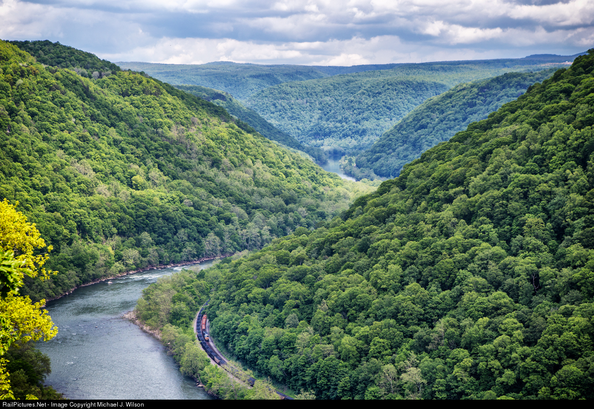 "Spring in the New River Gorge": The rear DPU of a CSX manifest train turns north in the New River Gorge enroute for Charleston, WV on May 18, 2021. Taken from the Concho Rim Overlook, it's not hard to imagine what the settlers and land surveyors had to conquer following the Civil War for the construction and completion of the Chesapeake & Ohio Railway. Filled with dense forests and a river not always appealing to cross, the New River Gorge is about as close to "wilderness" as you can get in the East. The C&O completed their mainline through the New River Gorge in 1873. Notice in the center top right of the image the mainline snaking its way ahead to Charleston, WV.