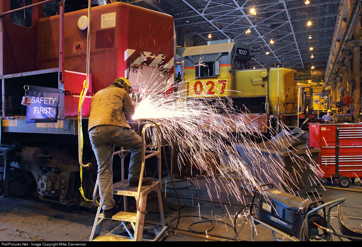A welder works on Helm Financial Corp. (HLCX) EMD GP38-2 No. 3837 at the boilermakers area inside the vast halls of Union Pacific’s Downing B. Jenks Shop at North Little Rock, Arkansas, on May 18, 2015.