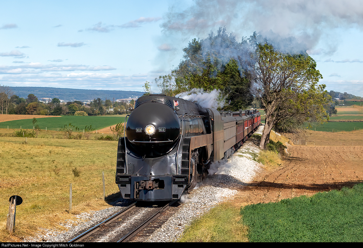 Norfolk & Western's 4-8-4 J-Class locomotive leads a passenger car excursion through the rural Amish countryside while on a visit to Pennsylvania at the Strasburg Rail Road. Somewhat far removed from her 1950's routing; Norfolk, VA to Cincinnati, OH, but very, very well patronized!