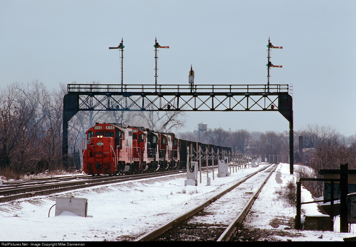 An eastbound Chicago Central & Pacific coal train rumbles through Joliet, Illinois, on February 22, 1989. CC&P was formed on August 27, 1986, to operate Illinois Central’s Chicago to Omaha, Nebraska, main line and associated branches to Cedar Rapids and Sioux City, Iowa. Several regional railroads like CC&P and IAIS relied heavily on rebuilt GP8 and GP10 locomotives from Illinois Central as early power for their trains. This coal train was unloaded at the ComEd power plant just south of Joliet and is now head back north for home rails.