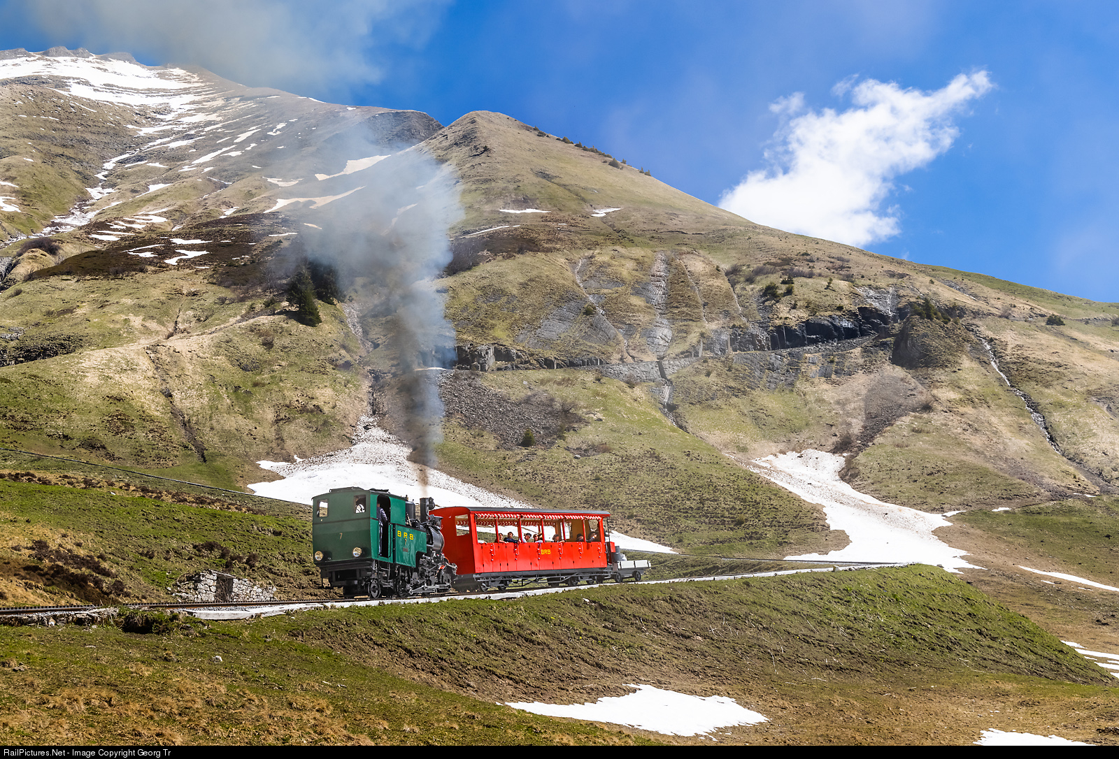 | A steamtrain with coalfired H 2/3 # 7 of the Brienz-Rothorn Bahn is tackling the grade of 25.0 % of the Chuemad on the journey up to the Brienzer Rothorn. You can see the line making zig-zag on the mountain slope. The P.M. photo charter could go to Oberstaffel (1818 meter a.s.l.) this day only, there is too much snow in the upper part yet. |
