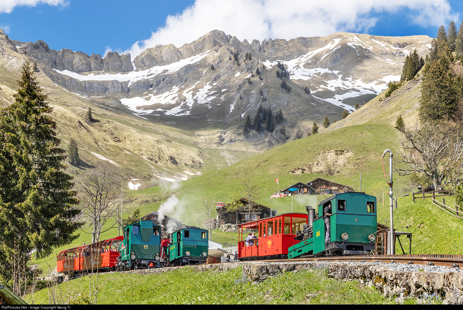Three steamtrains of all generations of the Brienz-Rothorn Bahn (BRB) on Planalp, half way up to the top. This day, the timetabled trains are running to this point only, because there is too much snow up on the mountain. On the left timetabled train 77 which just arrived from Brienz with oilfired H 2/3 # 15 built 1996. In the middle photo charter with coalfired H 2/3 # 7 of 1936. On the right the H 2/3 # 2 of 1892 with the fireman training train. The BRB is offering three days courses to learn how is operated and fired a cogwheel steamlocomotive. Of course, this is not a real training, but more of an experience and is always booked out early.