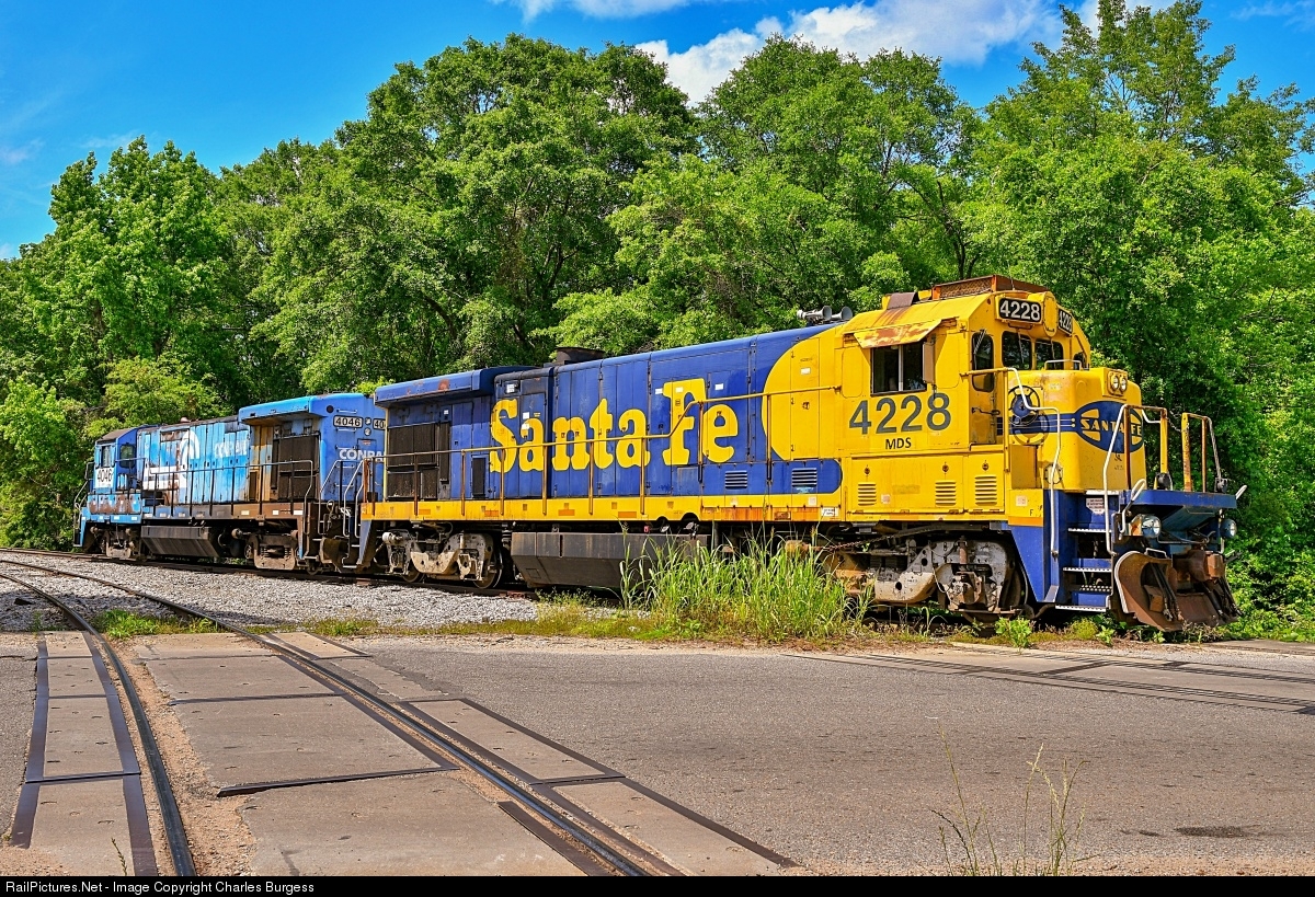 | Santa Fe and Conrail in 2021? A 1979 built General Electric B23-7 is still in a mostly untouched Santa Fe bluebonnet paint scheme over 40 years after coming from the factory. The Meridian Southern has quite a collection of old Dash 7 power that is used to move freight through rural Mississippi. |