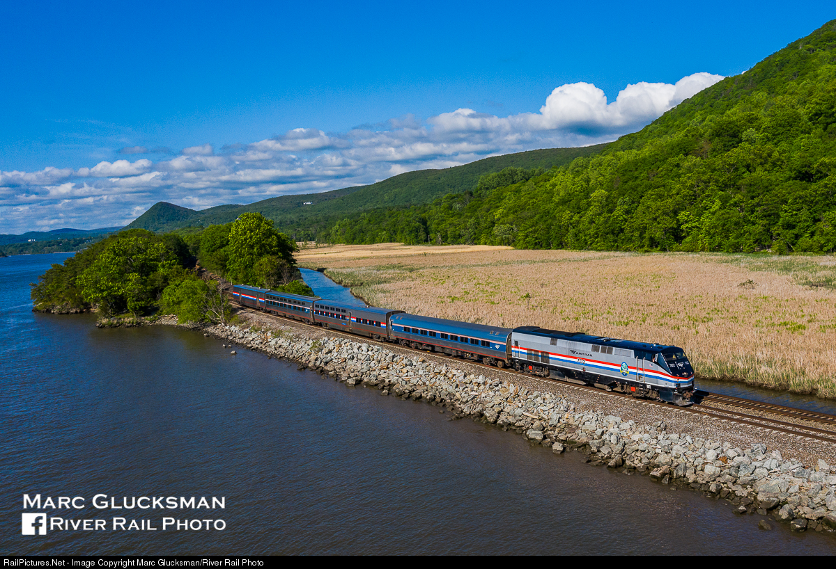 Now Longer And Stronger. Just over a year ago today on May 25, 2020, the Amtrak Lake Shore Limited was down to just 4 cars (coach+diner/sleeper lounge+sleeper+baggage) between Albany-Rensselaer, New York and New York Penn Station, as P32AC-DM 702 leads this shortened consist down the Hudson River near Manitou, New York. By October of 2020, service frequency was reduced to tri-weekly between New York, New York/Boston, Massachusetts and Chicago, Illinois due to COVID-19 related reduced ridership. On May 31, 2021, Amtrak will restore daily service on this and 3 other long distance routes, the mid-point of a 3 week process of restoring daily service on the 12 routes that saw their service frequency reduced (The Auto Train has remained daily, the Sunset Limited and Cardinal will remain tri-weekly as they have for many years).