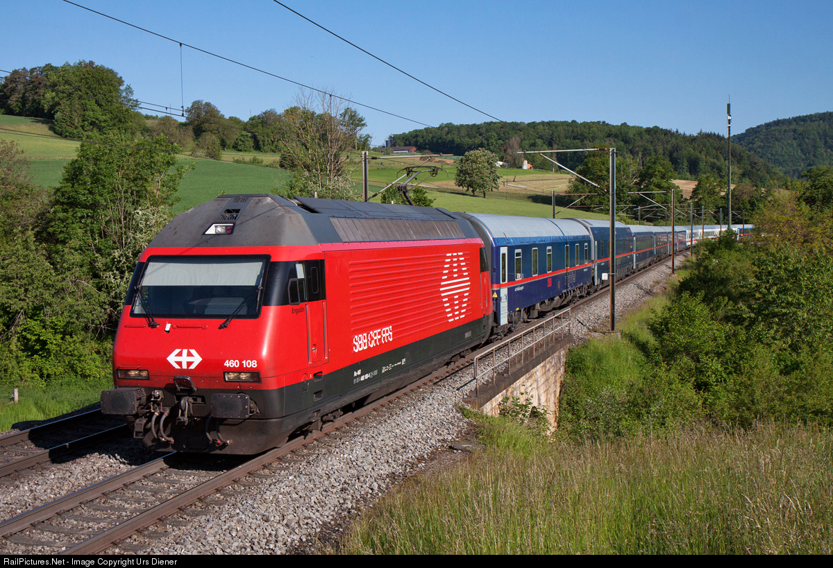 | The SBB locomotive Re 460 108 is pulling NightJet 471 from Berlin Hbf (Germany) to Zürich HB on the Bözberg north ramp. |