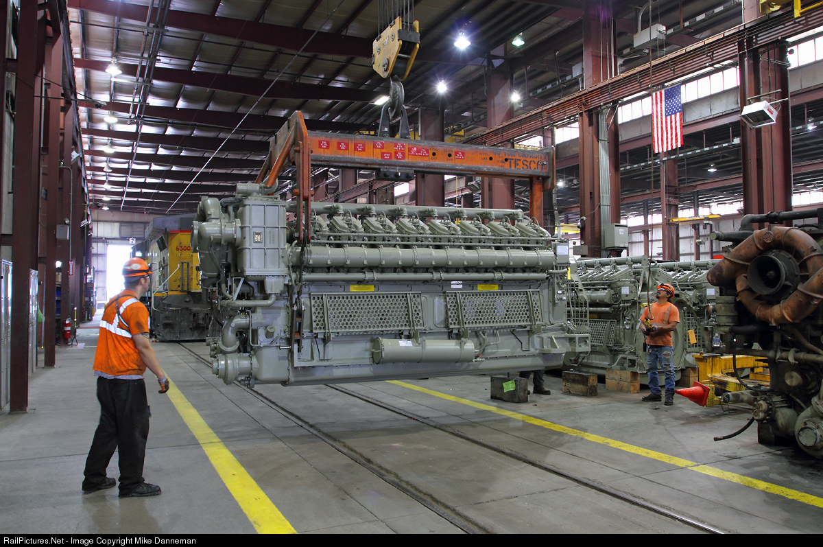 A new GE 7FDL16 prime mover is carefully moved across the shop floor via overhead crane for installation in Union Pacific GE AC4400CW No. 6704 during an overhaul at UP’s South Morrill Locomotive Facility on September 14, 2017. They’ll have to dodge sister AC4400CW No. 6300 in the process.