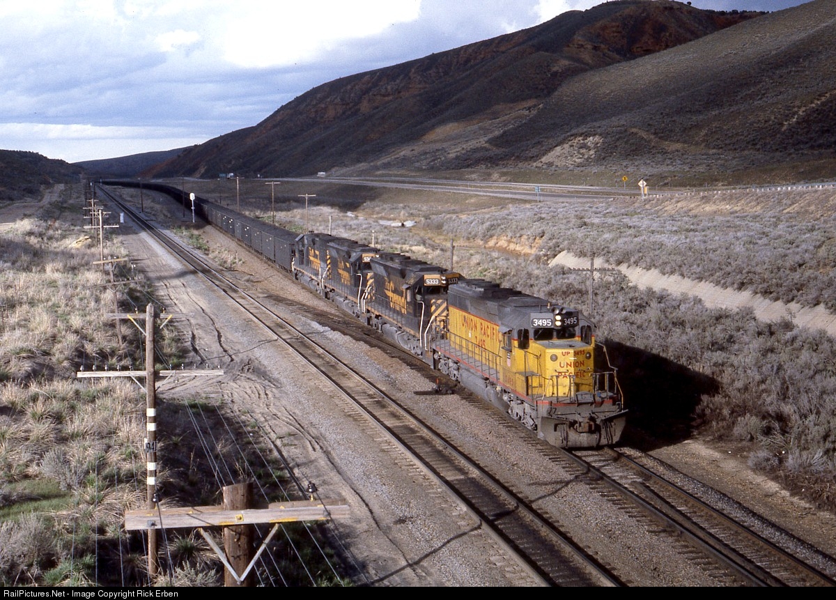 In April of 1983 a mudslide inundated the town of Thistle, UT as well as the Rio Grande tracks. For nearly three months, the Rio Grande was forced to use the UP from Denver to Ogden until a new alignment and tunnels could be constructed. Since UP was cab signal territory, UP leaders were required. As such, UP 3495 leads three D&RGW SDs on a coal train that would normally have run over Soldier Summit but has come the long way around through Wyoming. The crossover here at MP 941 marks the point where the tracks separate to the top of the grade at Wahsatch. The westward track, on its early alignment and steeper grade, passes above the eastward track at Curvo, thus it is left-hand running from Curvo down to Peterson in these Rule 251 (current of traffic) days. UP train dispatchers each received a basket of Colorado peaches for their trouble in handling the additional traffic; yet the Rio Grande detours were always powered up and moved right along.