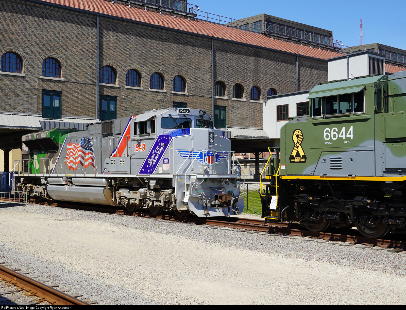 | UP 1943 "Spirit of the Union Pacific" and CP 6644 with commemorative WWII military paint schemes are on display for train days at the St. Paul Union Depot. This weekend marks the 77th anniversary of D-Day. The skylight windows of Union Depot were blackened with tar during WWII when troops were being deployed and then were restored in 2012 when Amtrak service returned. |