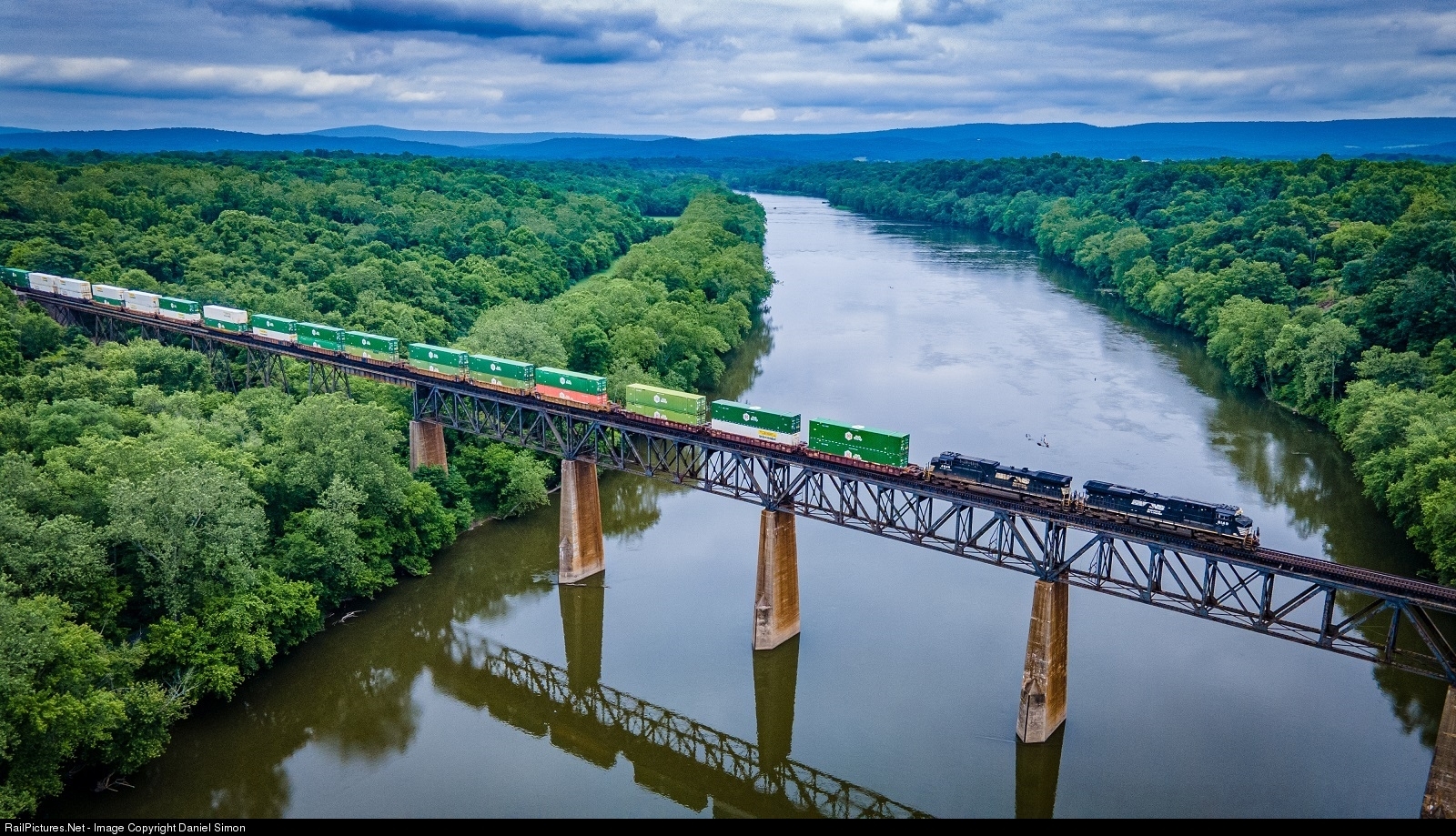 Norfolk Southern train 201 (Rutherford, PA-Rossville, TN intermodal) crosses the Potomac River from Maryland into West Virginia southbound on the Norfolk Southern Hagerstown Districts.