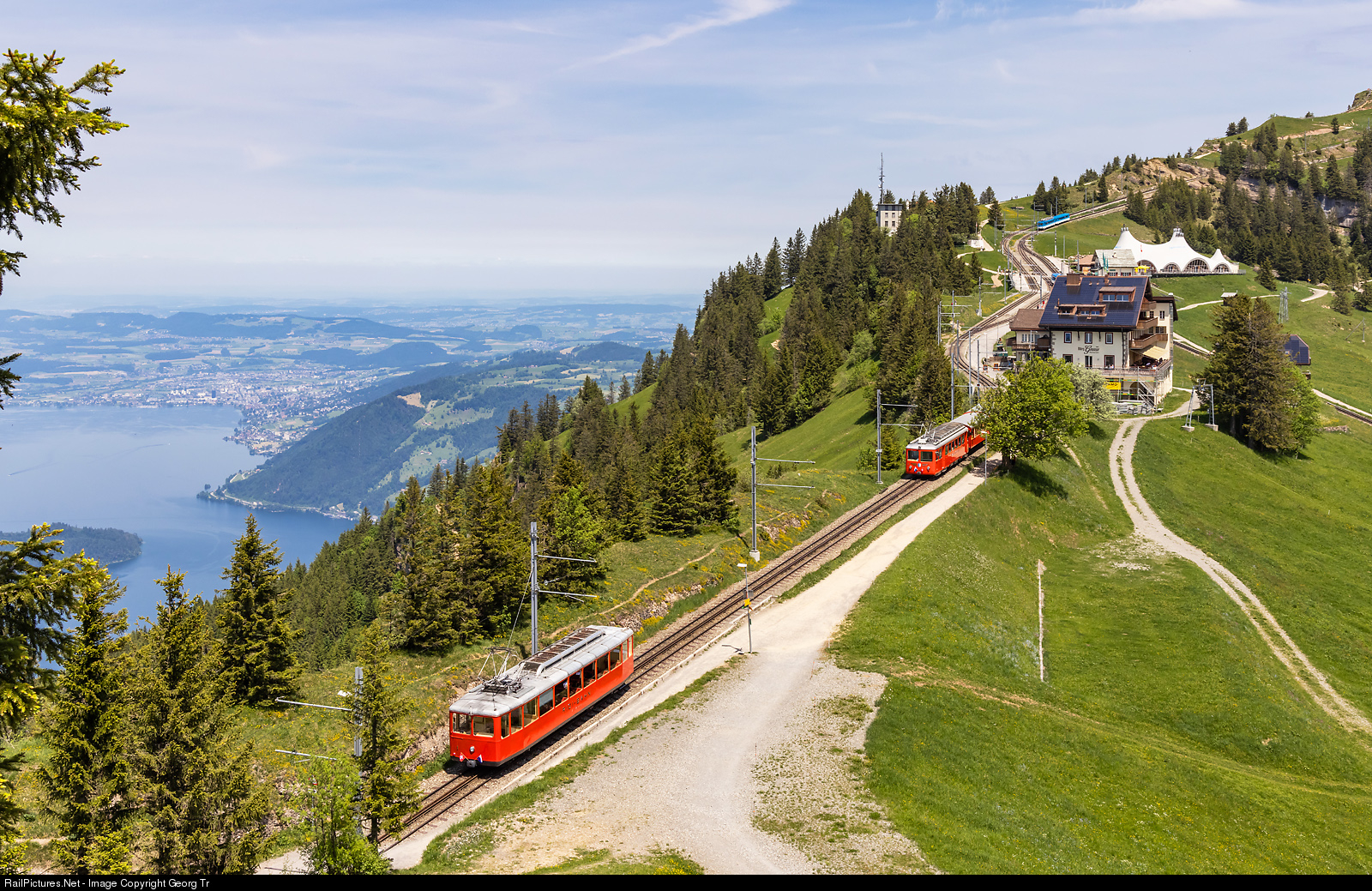 During the summer, every wednesday there is "Rigi Historic Day", with vehicles running which are all more then 50 years old. Cogwheel railcar Bhe 2/4 # 1 of 1937 is following BDhe 4/4 # 5 of 1964 on sight distance as train CC 1133b/a between Rigi Staffelhöhe and Rigi Staffel. In the background is the white/blue train BDhe 2/4 # 13 with cab car Bt # 23 visible, running from Arth Goldau to Rigi Kulm as train CC 145.