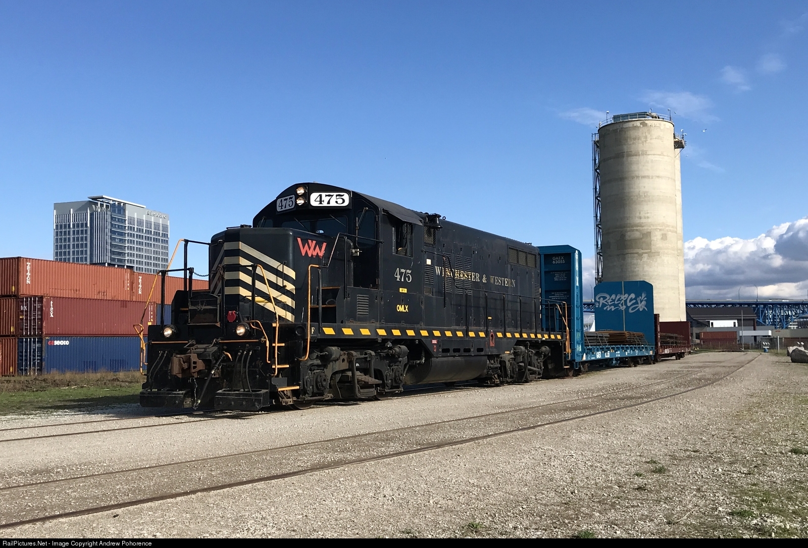 | Built as Nickel Plate Road #475, Then to Norfolk & Western as #2475. Now former Winchester & Western #475 after being purchased by OmniTRAX. The locomotive has found a new home for the time being working for The Cleveland Port Railway after OmniTRAX purchased The Cleveland Harbor Belt Railroad. The locomotive is seen pulling two steel loads around the loop track on the port from the NS/CSX interchange next to the Cuyahoga River. |