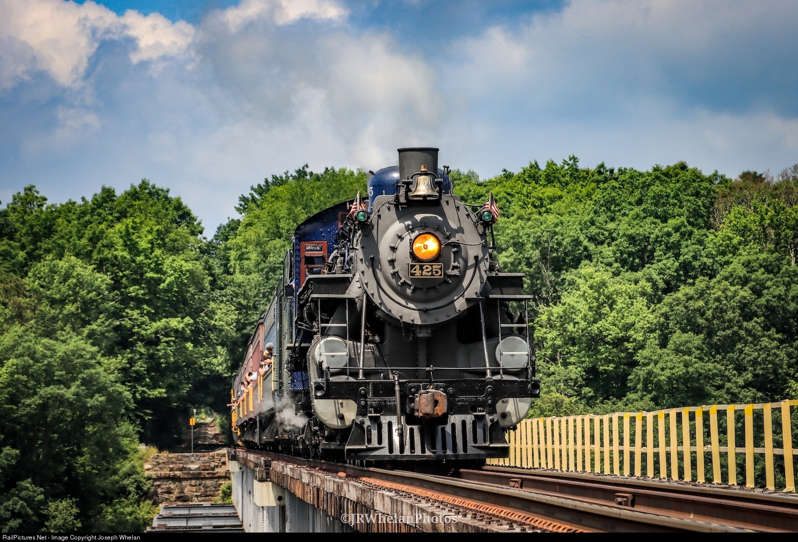 | Reading & Northern 425 slowly crosses the Hometown High Bridge, giving passengers beautiful views of the valley below. This impressive structure spans 1,168 feet and rises 168 feet above the Little Schuylkill River. |