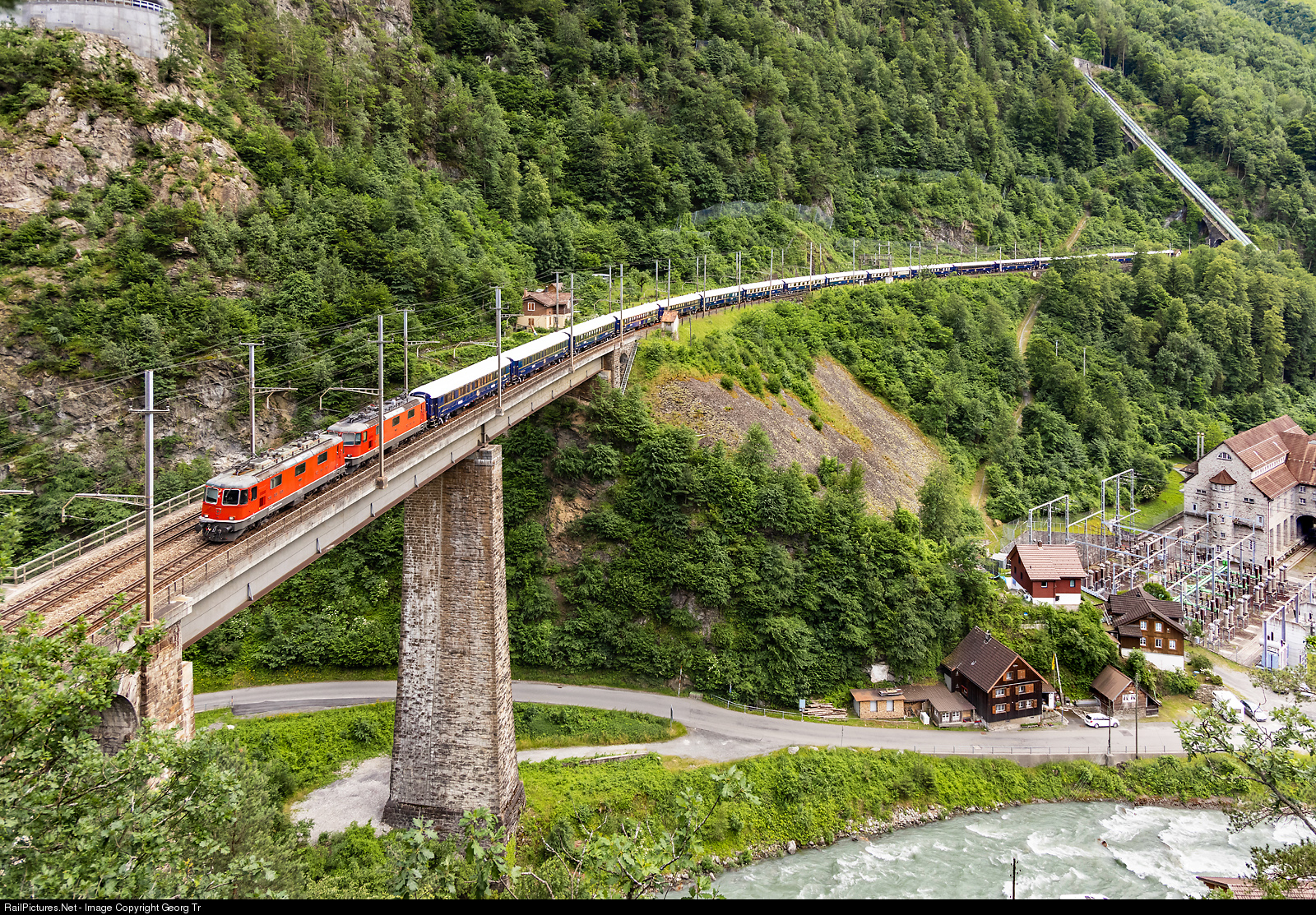 Re 420 # 199 and # 157 (Re 4/4 II # 11199 and # 11157) of the SBB in multiple control are crossing the 53 meter high and 127 meter long Chärstelenbach viaduct on the Gotthard north ramp between Gurtnellen and Amsteg-Silenen, pulling the 17 cars high luxury train "Venice Simplon-Orient-Express" (VSOE) of the Belmond company. The train run from Venice via Milan-Gotthard-Basel-Paris Gare du Nord to Calais. In the UK the Belmond British Pullman is used til London. Later this day, the train was stopped in Arth Goldau for several hours, because of a line interruption in Rotkreuz due to a very heavy thunderstorm with hail. The train left Switzerland in Basel after midnight finally.