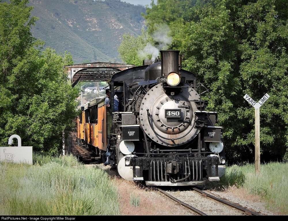 | DSNG 480 leads the 9AM excursion across the Animas River and out of downtown Durango, CO on a sunny, summer morning. |