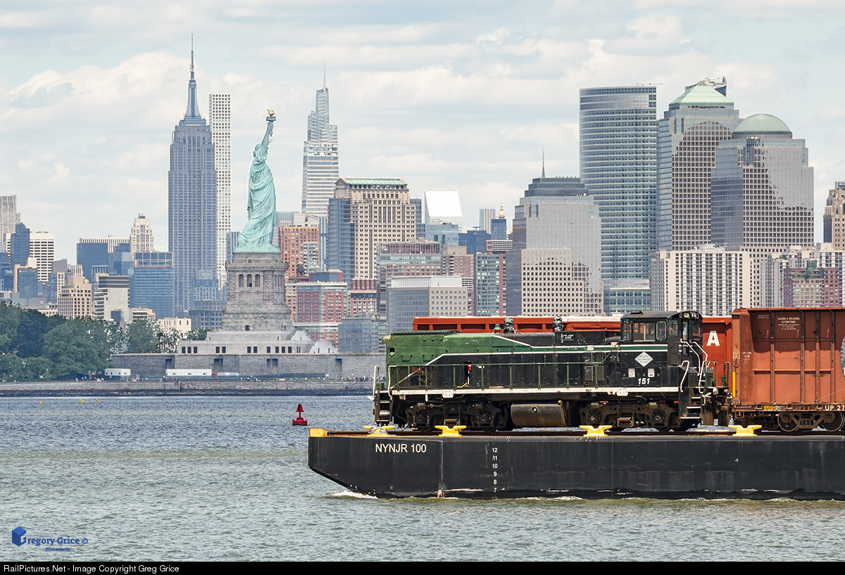 On the afternoon of June 23rd, 2021, New York & Atlantic Railway MP15AC 151 is seen passing the Statue of Liberty and iconic Manhattan skyline as it traverses the New York Harbor on one of New York New Jersey Rail's car float barges. The locomotive is on its way to Metro East Industries in East St. Louis, Illinois for rebuild, upgrades and repaint.