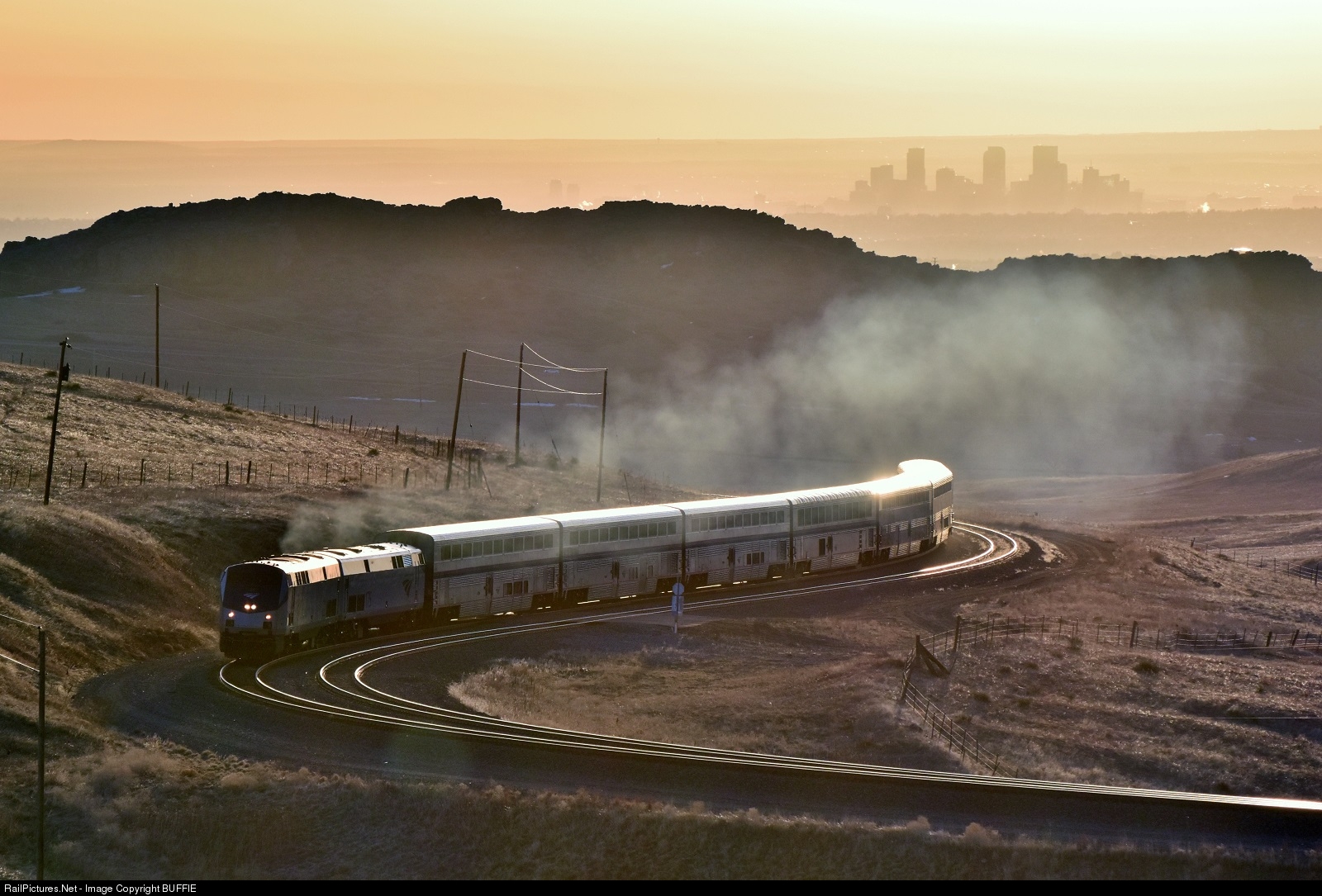 An orange tinted sunrise catches the Winter Park Ski Train as it heads through Little Ten Curve on its way into the Colorado Rocky Mountains. Skiers and rail fans are excited at the prospects of being able to ride the Ski Train to Winter Park and back this coming winter.