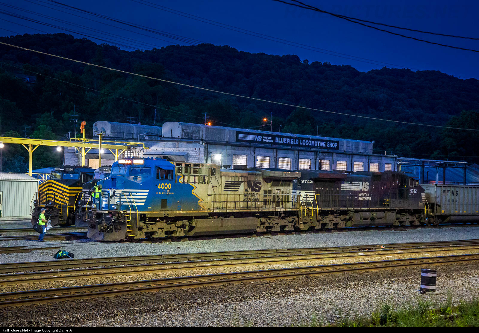 | Hopper train NS 815 has made it into Bluefield yard and a crew change is under way. The train will be split in half, the first half with 4000 leading will go down the Clinch Valley and the second half will go down the pokey to be loaded. Sitting to the left of 4000 at the fuel rack is the Nickel Plate heritage unit. It is in pusher rotation for the area. |