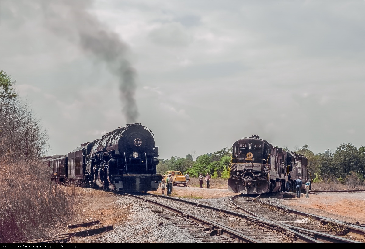 The locals have shown up to see the steam engine, but all eyes seem to be on the diesels while the fire-breathing monster simmers behind them. I’m not sure of the exact sequence here, but the 1218 had brought some freight from Roanoke on a ferry move, and was now on the south leg of the N&W wye in Lynchburg, Virginia, waiting to for an Alexandria – Lynchburg excursion to arrive on the Southern main. The big 2-6-6-4 would return the passengers to Alexandria, and the FP7’s would get back north either light or on another freight move. The 1218 was a fan favorite, but its length prohibited the use of most turntables on round trips, making NS have to plan logistics centered on where wyes were available.