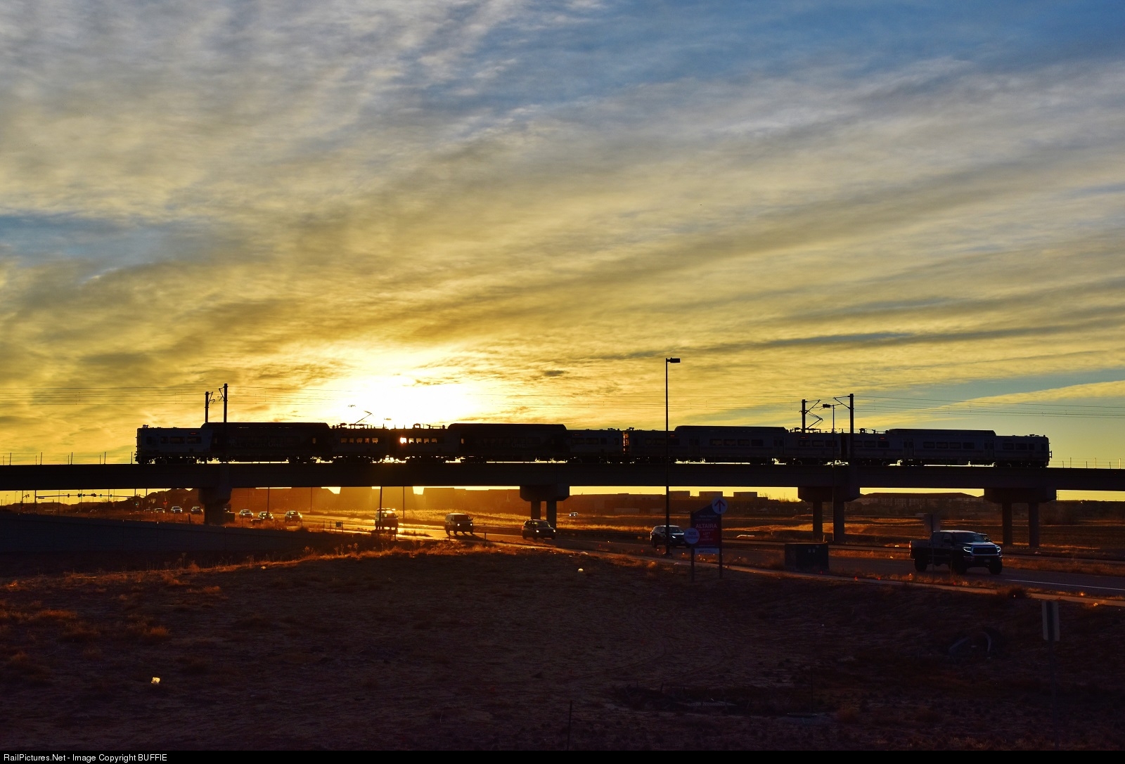A dynamic sunrise greets the riders of RTD commuter train #4038 as it heads towards Denver International Airport.