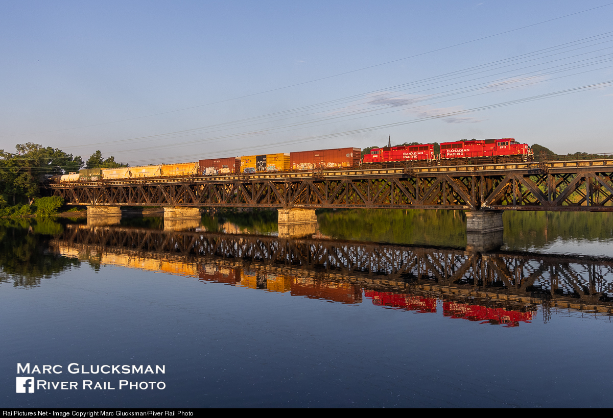 Mohawk Morning. The normal early morning run of Canadian Pacific D48 was even earlier than usual on Tuesday, June 29, 2021. When the crew called the CP D&H dispatcher to depart Kenwood Yard in Albany, NY at 0523, daylight was not yet available. But at 0603, the the sun has started to come up brilliantly over the horizon to illuminate a pair of EMD GP20C-ECOs (CP 2215/CP 2260) leading a lengthy consist to Saratoga Springs, seen here crossing the former Delaware and Hudson Railroad bridge over the Mohawk River in Cochoes, New York.