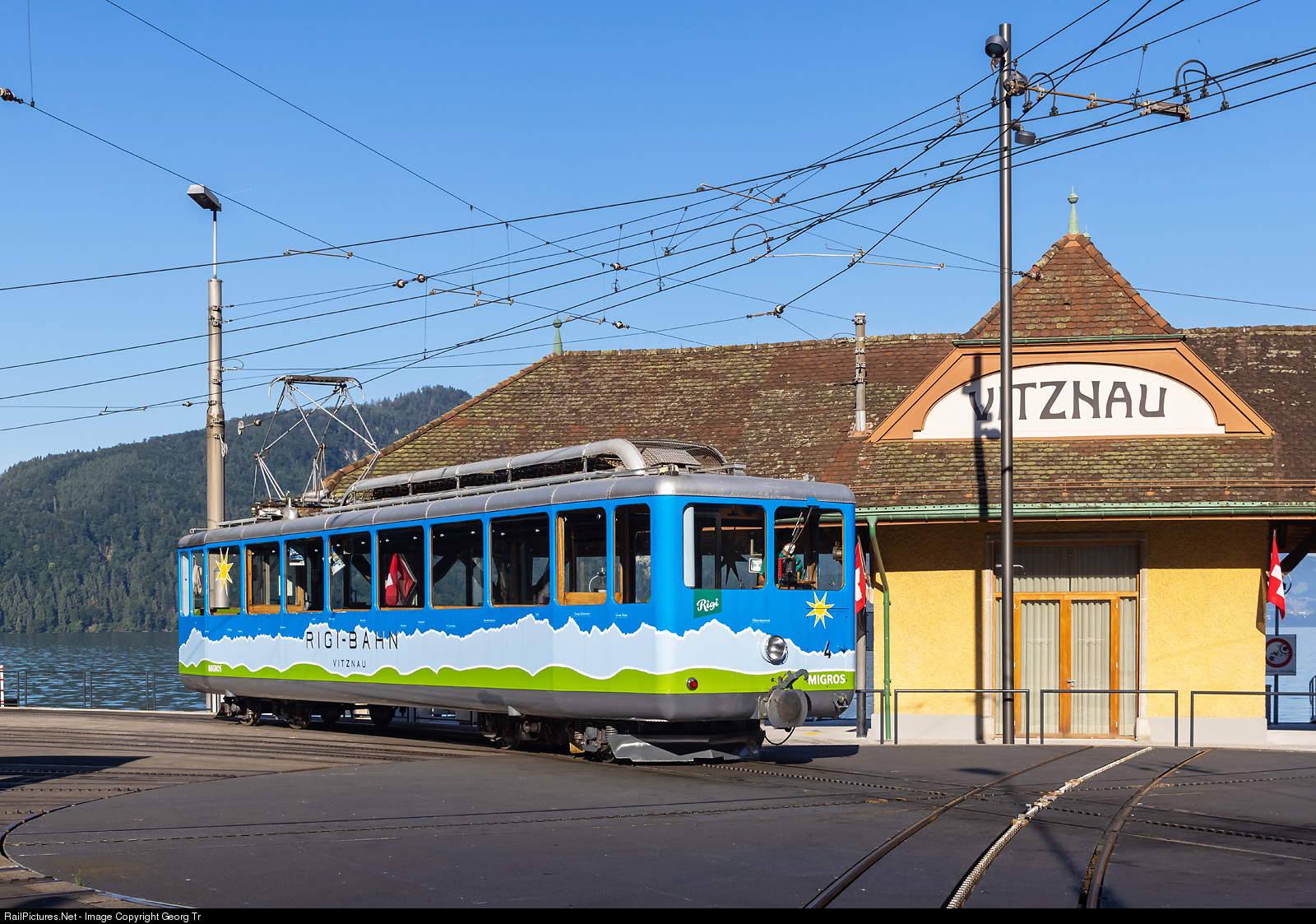 Cogwheel railcar Bhe 2/4 # 4 of the Rigi Bahnen in Vitznau in front of the ship station building of 1912, which is listed as historical monument. The railcar was built in 1953 by SLM Winterthur and has this publicity paint scheme for the Migros Luzern (large swiss retailer) since may 2019. The turntable in Vitznau has now 3 crossing cogwheel tracks, one is straight, the two others have different radii.