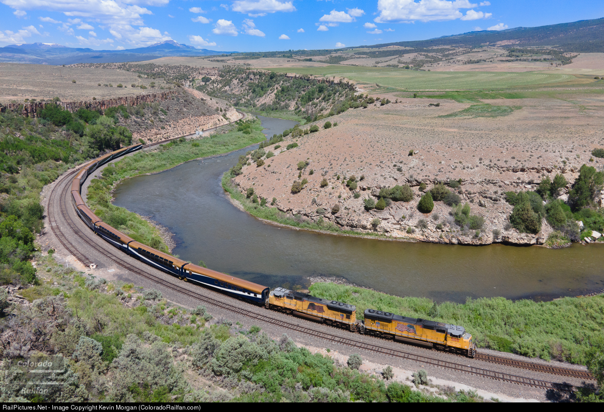 On the main at Dell, the eastbound Rocky Mountaineer wraps along the Colorado River with a pair of UP SD70Ms on the point. Dell is one of two sidings on the Dotsero Cutoff between Dotsero and Bond. As is the case with most siding, it also has a house track, although it is a stub end house track, only accessible from the west. There have been rumors in the last year or so that UP has considered taking Dell out of service, spiking the switches, to reduce the amount of maintenance required on the former Rio Grande. So far, that has not happened.