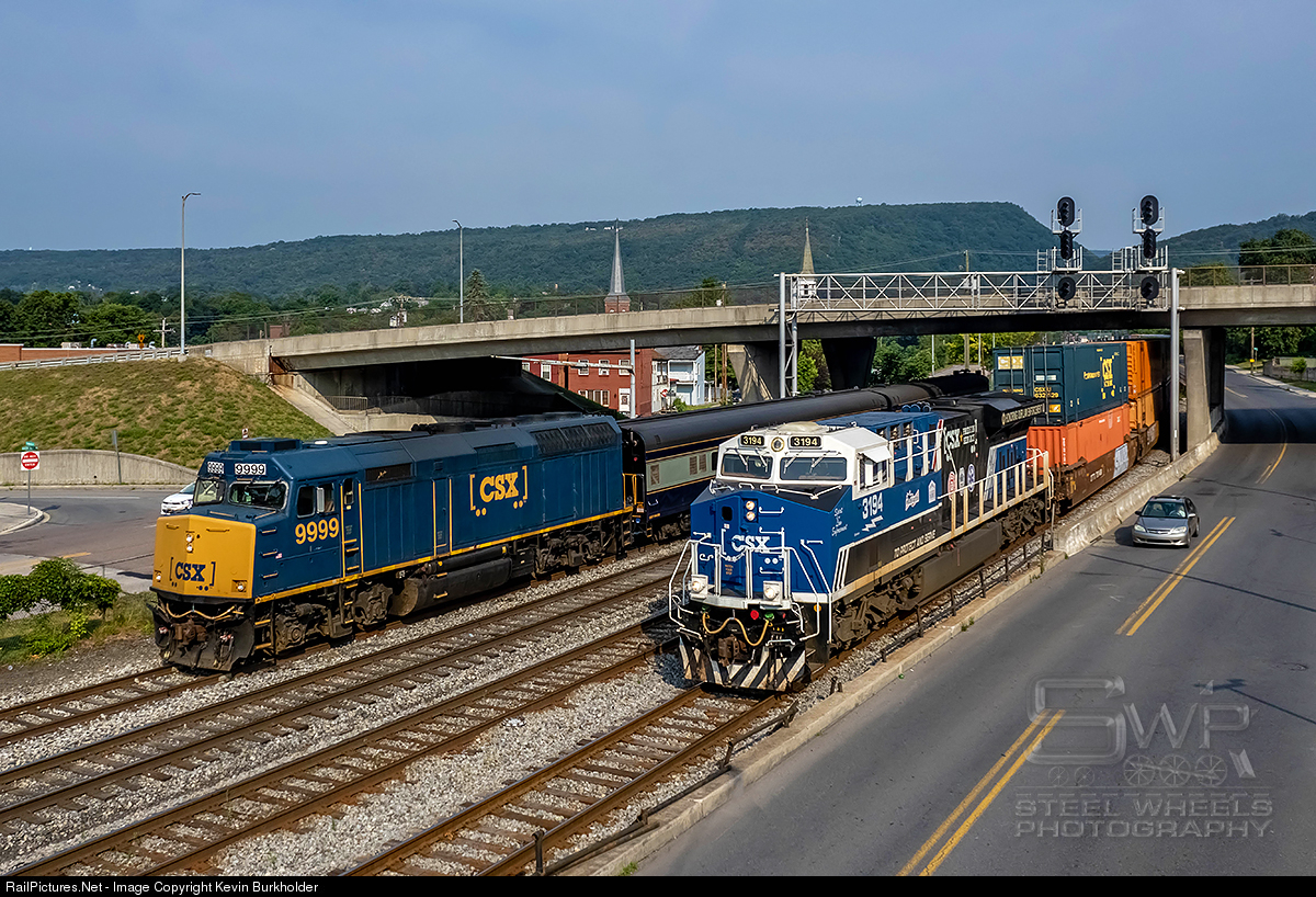 | CSXT Spirit of Our Law Enforcement ES44 3194 rolls though Viaduct Jct. at Cumberland, MD with Q01604, as the pass the W00306 geometry train with F40PH 9999. |