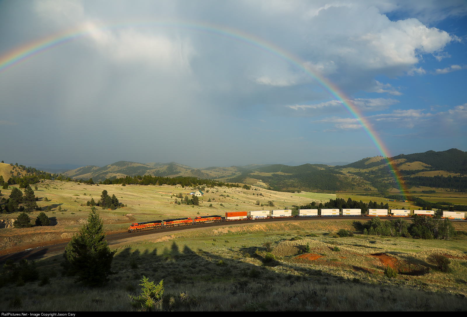 A Westbound Intermodal curves around the upper horseshoe of the Austin Loops and under a bright rainbow from a exiting storm. The MRL has been moving a increasing number of intermodal trains the last couple of years...