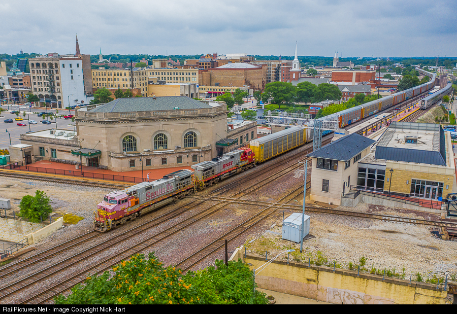 Joliet Union Station....where it all started for me as a kid. I have many fond memories of watching trains at that very platform, including what is shown in this photograph...Warbonnets. Nearly 26 years after the BN and ATSF merged, it's still possible to shoot Warbonnets leading mainline trains on the BNSF. C44-9W #649 may look tired and faded, but I always cared more about the history. Sister #763 trails and its paint has managed to hold up quite well. The two veterans are in charge of a westbound Blue Island, IL to Clovis, NM vehicle train as they pass the old station and UD Tower. Union Station opened in 1912 and while it closed in 2014 in favor of the Joliet Gateway Center, it is still open for weddings and special events.