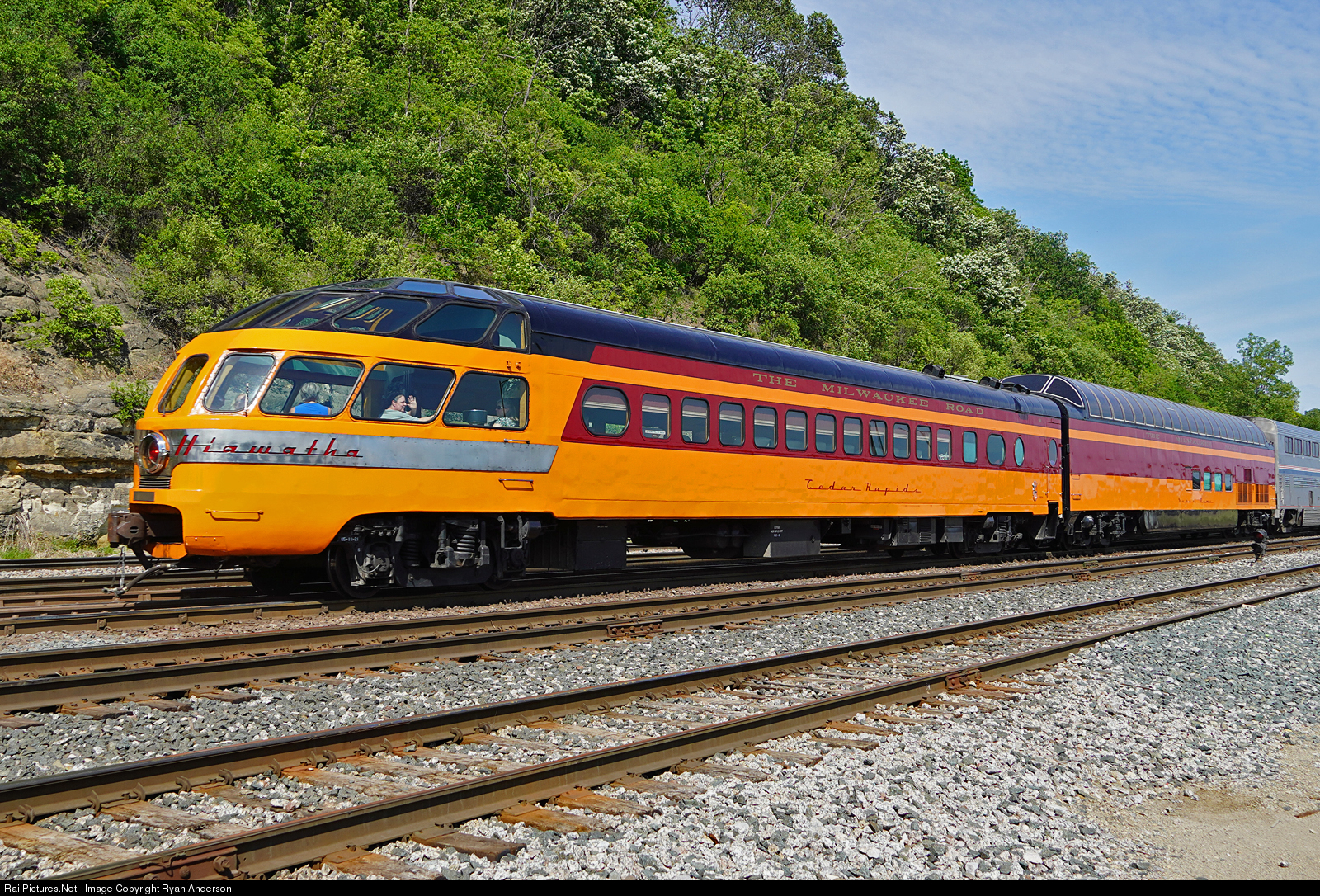 The Empire Builder heads east with the Friends of 261 Super Dome and Cedar Rapids cars on the end. Passengers of the Windy City excursion have just departed the St. Paul Union Depot.