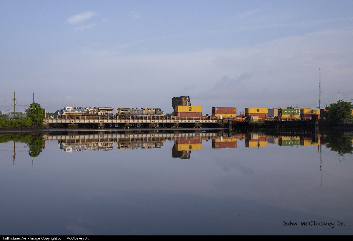 CSX's Spirit of Law Enforcement unit is seen leading hotshot UPS train Q01011 south across Overpeck Creek in beautiful early morning light as the water rises allowing a nice refection.