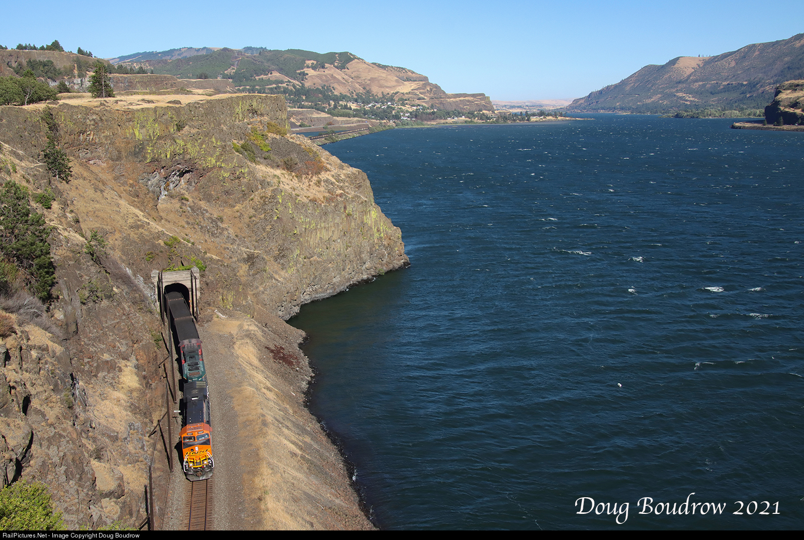 BNSF coal train C-SXMRBG is seen passing the basalt cliffs just West of Lyle as it emerges from Tunnel 9 along the Columbia River Gorge on the BNSF Fallbridge Subdivision.