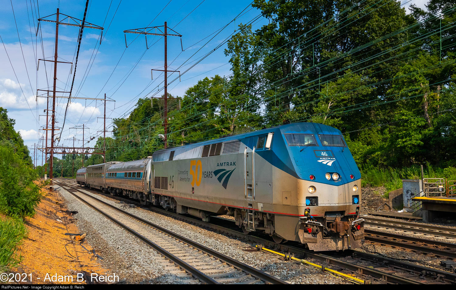 PTC Special at Metuchen: After a quick trip up to New England for Positive Train Control testing along the Downeaster route, Phase V 50th Anniversary P42 #46 leads the set past Metuchen, NJ en route to Philadelphia. The consist also included Metroliner conference car #9800, a Viewliner II sleeper, and Amfleet business car #10001 "Beech Grove."