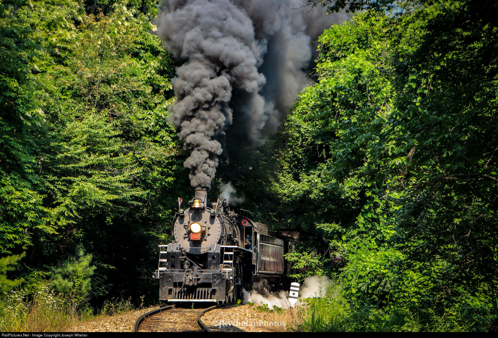 | In the morning haze, Great Smoky Mountains Railroad 1702 turns day into night at Robinson Gap, leading 17 cars the 2-3% grade. |