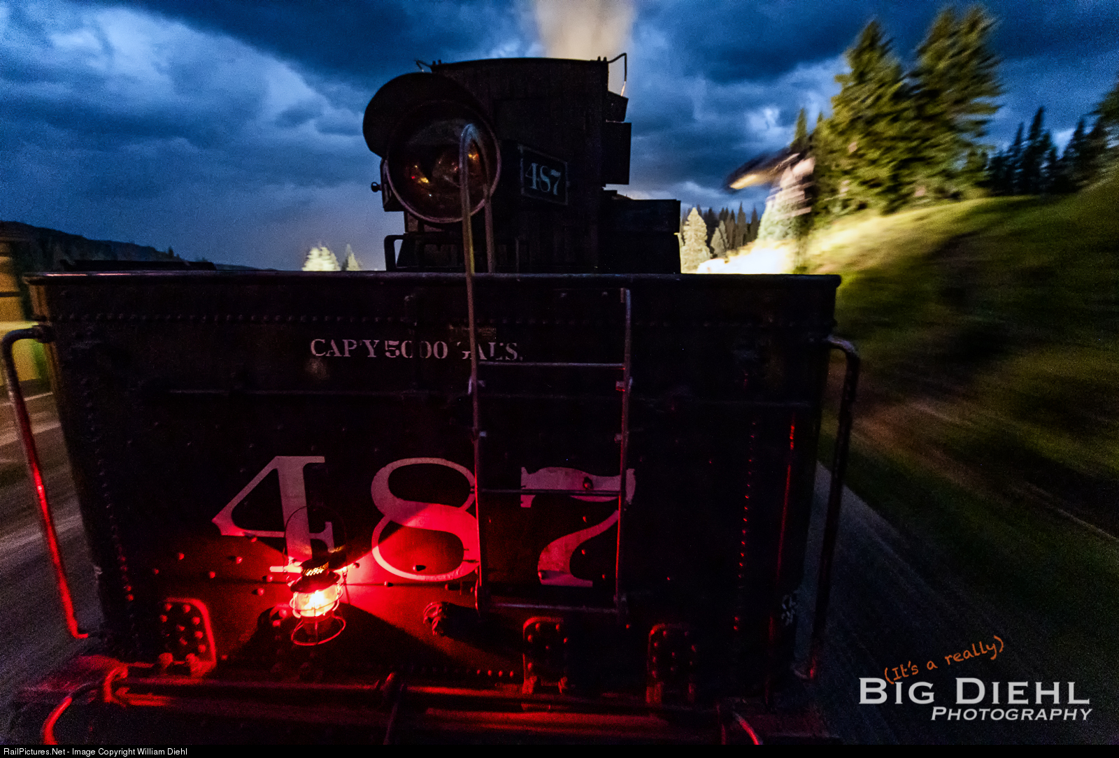 While it's not the winter, we're under the full moon of a Rocky Mountain summer, albeit, one hidden by monsoonal moisture. Here we see Cumbres and Toltec K-36 487 pull up to the water standpipe at the summit. Ahead, 14 miles of 4% grade to descend in the darkness to Chama.