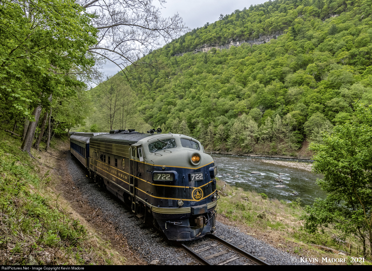 Running the South Branch Gorge. Far below the rocky cliffs, the Potomac Eagle Scenic Railroad's excursion train travels south along the South Branch of the Potomac River near Wickham, WV. The B&O-painted lead unit looks right at home here in old B&O territory, but she's actually a veteran of the Bessemer & Lake Erie Railroad, having spent a 50 year career hauling coal, coke and iron ore for that line before coming here in the early 2000s.