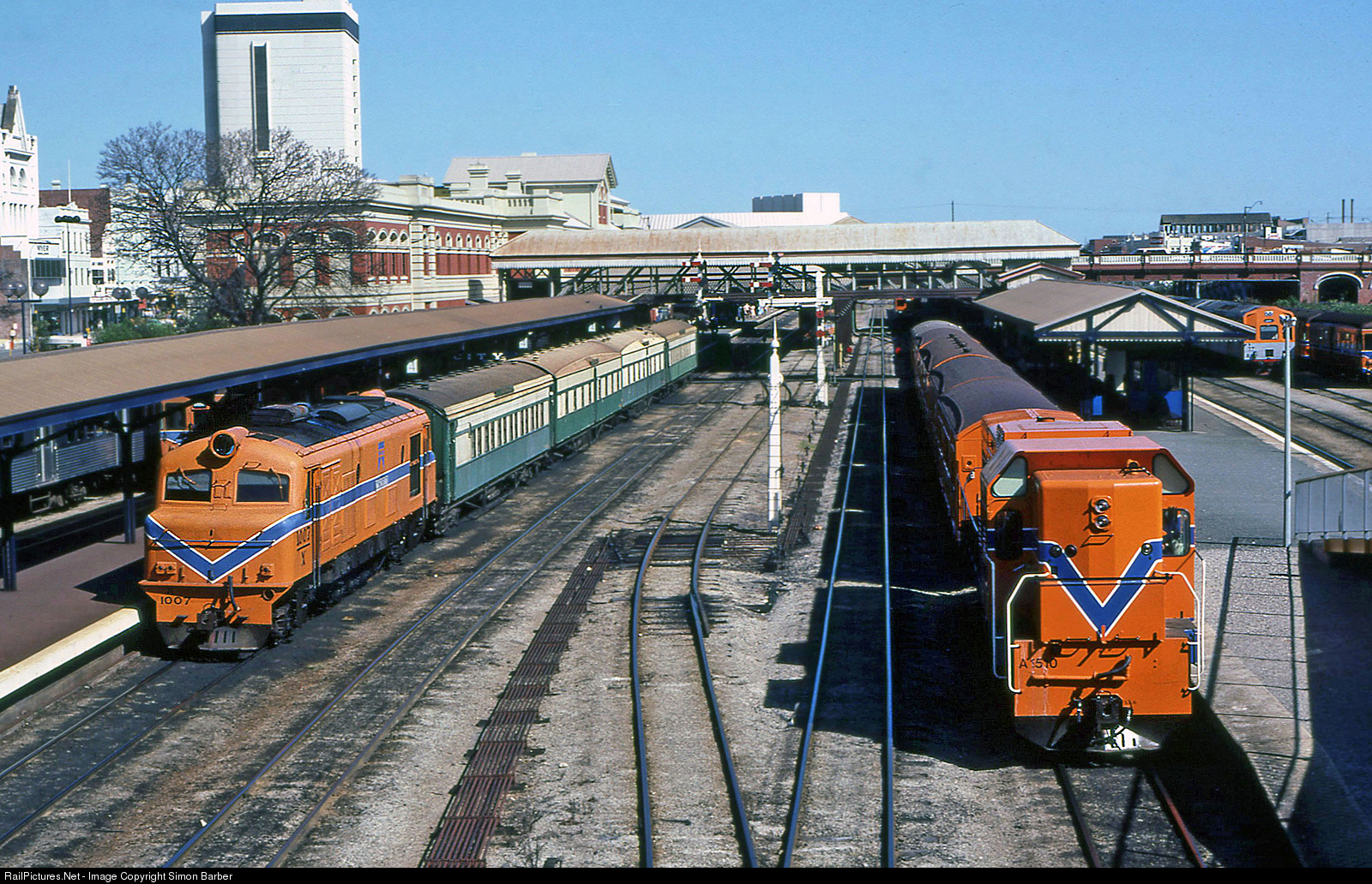 In a scene which has now totally changed, X1007 awaits a departure to Bunbury, and A1510 on a suburban train to Midland. This was at Perth's City station.