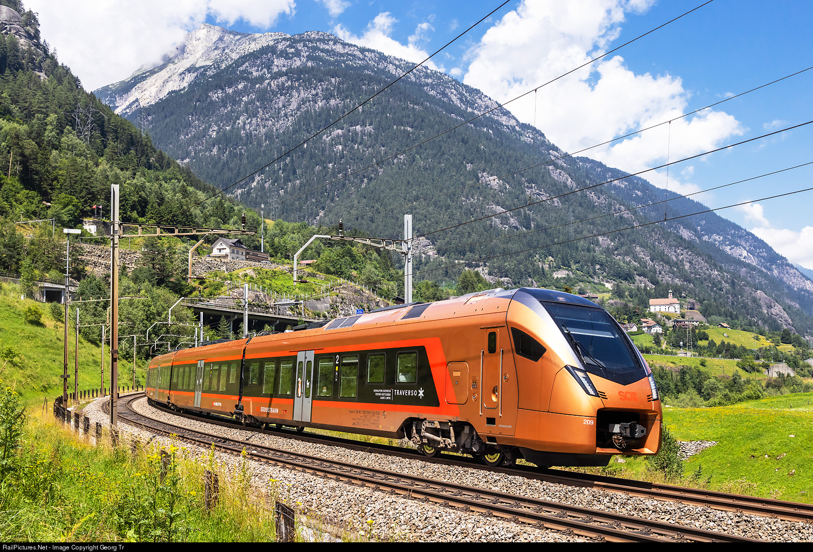 | "Traverso" train RABe 526 # 209/109 of the Südostbahn (SOB) is running the "Treno Gottardo" IR 2421 of the line IR 46 from Zürich via Zug-Arth Goldau-Erstfeld-Gotthard mountain line-Biasca-Bellinzona to Locarno, in the Wattinger curve between Gurtnellen and Wassen. |