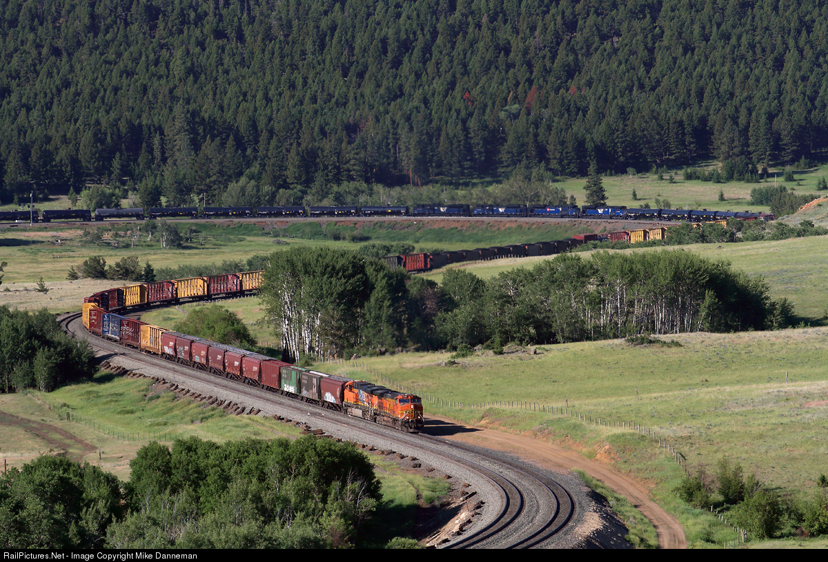 On the morning of June 30, 2021, a westbound BNSF freight climbs the 2.2 percent grade up toward Mullan Pass at Austin, Montana. The head end is one curve away from the big horseshoe curve through Iron Ridge cut. In the background is a Montana Rail Link manned helper set of four EMD SD70ACes, cut into the train about two-thirds from the rear, adding their 17,200 horsepower of tractive effort to getting the train over the pass.