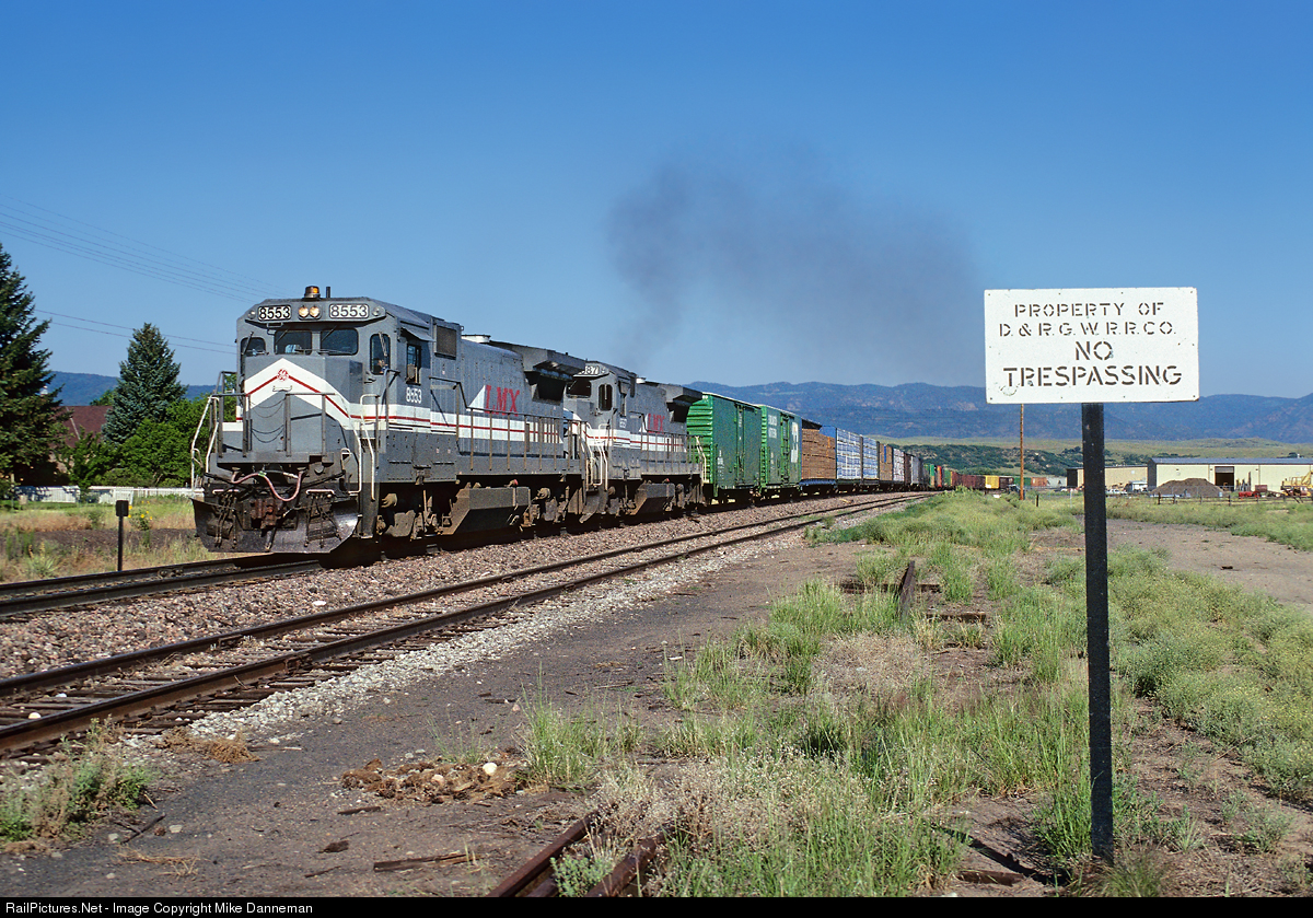 Colorado’s Joint Line between South Denver and Bragdon (Pueblo) is two parallel lines, one built and owned by Rio Grande, and the other built and owned by Santa Fe. Colorado & Southern, later Burlington Northern, also operated on the route. Simply put, the agreement is that Rio Grande route is used for southbound trains of all three railroads, and the Santa Fe route is used for northbound trains of all three railroads. In this view, a southbound BN freight, led by a pair of gray GE B39-8 LMX locomotives, heads south on obviously-marked Rio Grande property through Sedalia, Colorado, on the morning of July 7, 1989.