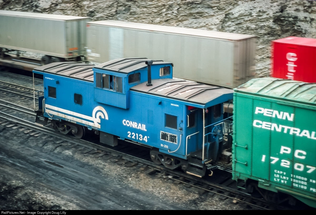 Tonnage is moving in both directions at Slope interlocking on Conrail’s ex-PRR main line in Altoona, Pennsylvania. While a westbound intermodal begins its climb to Cresson, the crew of an eastbound manifest enjoys the last minutes of a ride in one of only ten wide vision cabooses on the roster.