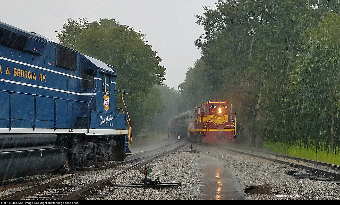 710 arrives @ the depot during a summer downpour. Chattanooga Tn